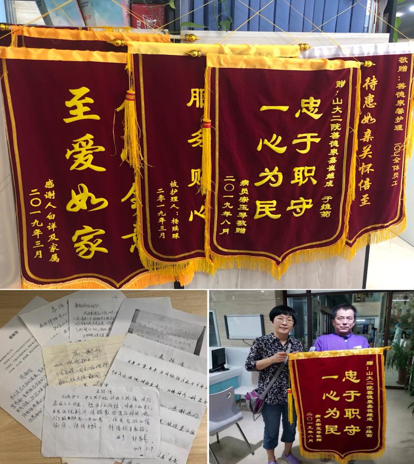 8月7日上午,山大二院患者家屬將一面印著“忠于職守,一心為民”的錦旗送至善德服務中心,以感謝護理員于維菊及派單員崔繼成對宗玉琴老人日常生活的精心照料。同日上午,神經(jīng)內(nèi)科4名護理員張迎奎、孫達珍等人收到董辛辛家屬表揚信,病人家屬對其在住院期間受到的精心護理和熱心服務表示感謝,并表揚了護理員不怕苦、不怕臟、不怕累的精神。