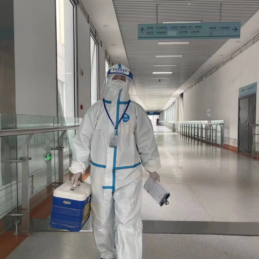 自4月26日以來,孫輝負責(zé)的就是核酸標(biāo)本轉(zhuǎn)運的工作,每天身著隔離衣,用最快的速度,穿梭在核酸檢測門診和檢驗科之間,轉(zhuǎn)運核酸標(biāo)本。