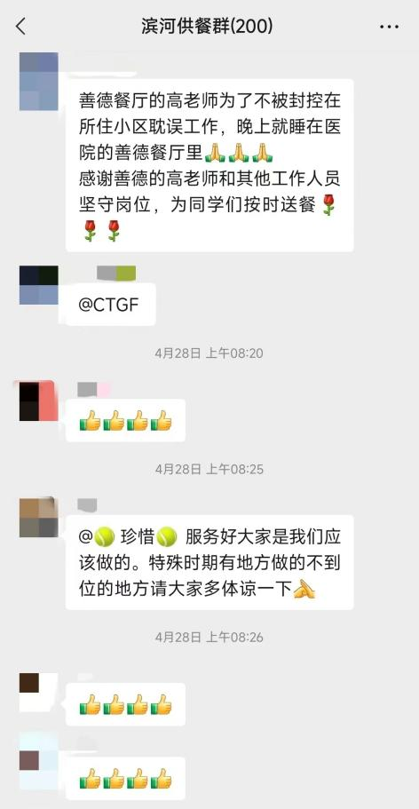 臨近“五一”假期,疫情防控形勢更加嚴峻,醫(yī)院開始實行閉環(huán)管理,濱河餐車供餐服務暫停,善德餐廳緊急研究決定外賣送餐服務,學生們只要提前在線上微餐廳下單,餐廳就會在就餐時間點準時送到,每天能夠保障100余人用餐需求。高曙峰再一次承擔起了濱河外賣送餐的任務,由于部分同事被封控在家,人手嚴重不足,為了不被封控在家無法到崗,高大哥主動申請留店,堅持每日準時送餐。他用實際行動和堅守詮釋了善德人的擔當和勇氣,他的付出和奉獻也得到了大家的夸贊。