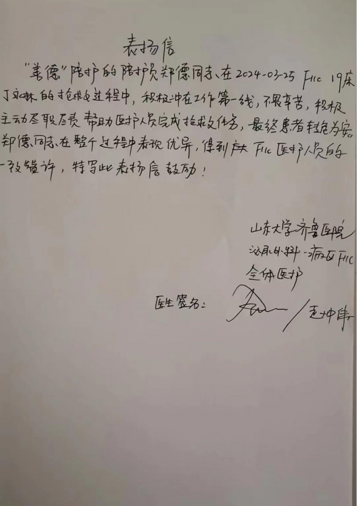 經(jīng)過(guò)連續(xù)一個(gè)多小時(shí)的手術(shù)緊急搶救,患者生命體征終于平穩(wěn)轉(zhuǎn)危為安。本該下班休息的鄭德,但是考慮到患者剛下手術(shù)臺(tái),家屬情緒還未平復(fù),他還是放心不下,又幫助往返藥房取藥,并陪同家屬將患者從手術(shù)室安全轉(zhuǎn)運(yùn)至ICU,再一次安撫了家屬情緒,并做了詳細(xì)全面的交接后才離開(kāi)。等回到科室已經(jīng)快晚上九點(diǎn)了,一下午沒(méi)顧上喝水吃飯的他,在身體從緊張的狀態(tài)抽離后才感覺(jué)口干舌燥、既餓又累。鄭德當(dāng)日專(zhuān)業(yè)貼心的服務(wù)也獲得了科室主任和醫(yī)護(hù)人員的贊許,并以科室名義寫(xiě)信給予表?yè)P(yáng)。