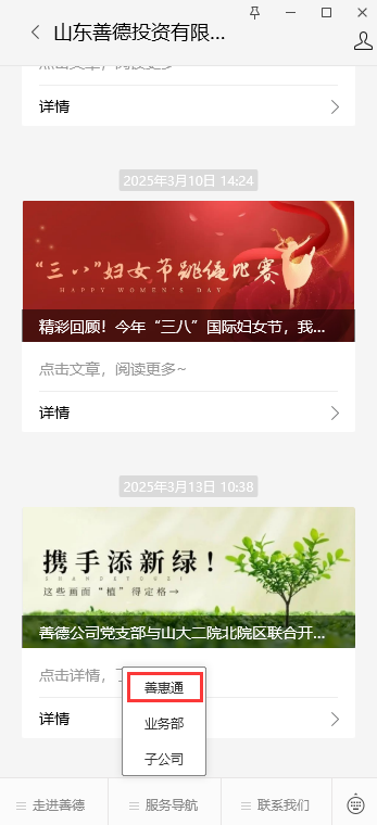 線上訂餐:關(guān)注“山東善德投資有限公司”公眾號(hào)-進(jìn)入菜單欄“服務(wù)導(dǎo)航”-“善惠通”。(首次使用后即可通過(guò)微信首頁(yè)下拉菜單快速進(jìn)入小程序訂餐)